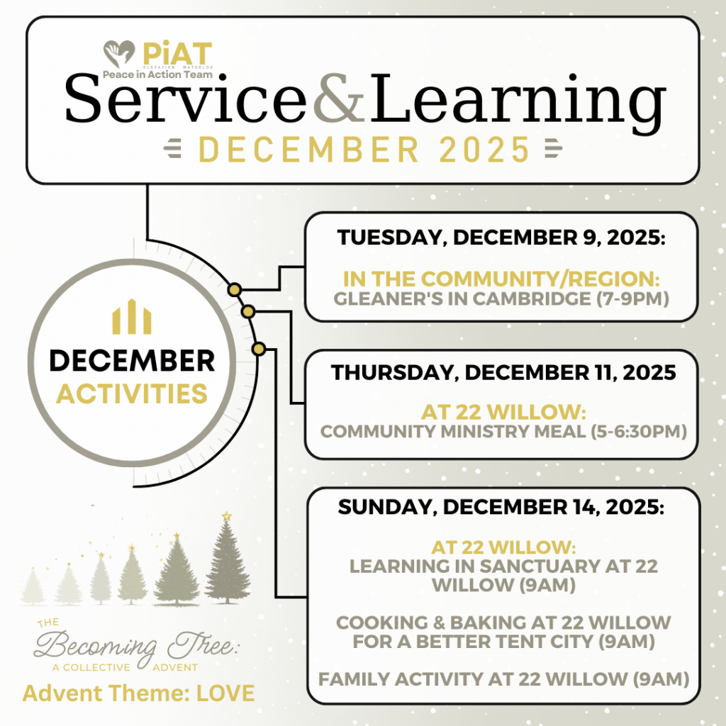Join us for our monthly Service and Learning gatherings. Some activities require registration, and some are drop-in. Please read below for all the details.